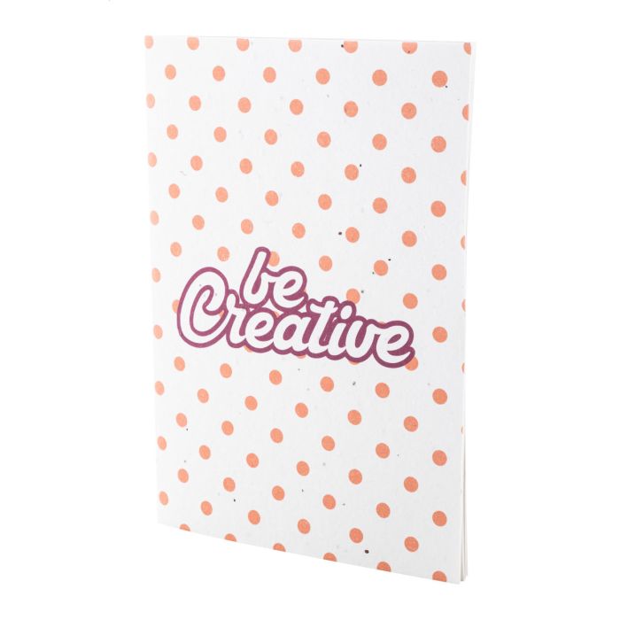 Caiet personalizat, acoperit cu hârtie de semințe, cu 32 de coli de hârtie reciclată, format A5. Prețul include copertă exterioară imprimată color. MOQ: 100 buc. Cu semințe de flori sălbatice asortate.