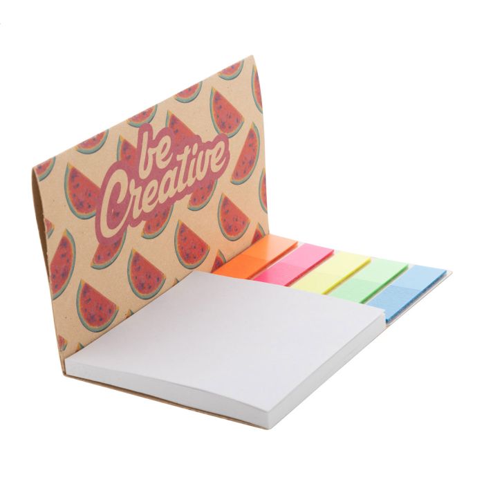 Distribuitor de note de hârtie kraft, realiazat la comandă, cu antet vertical. Include 50 de foi de note adezive din hârtie reciclată (75×75 mm) și 100 de markere de pagină din folie de plastic în 5 culori asortate (44×12 mm). Prețul include imprimarea color pe antet. MOQ: 100 buc.