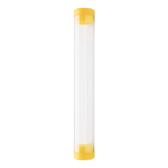 Etui din plastic transparent pentru pix, cu capace colorate.