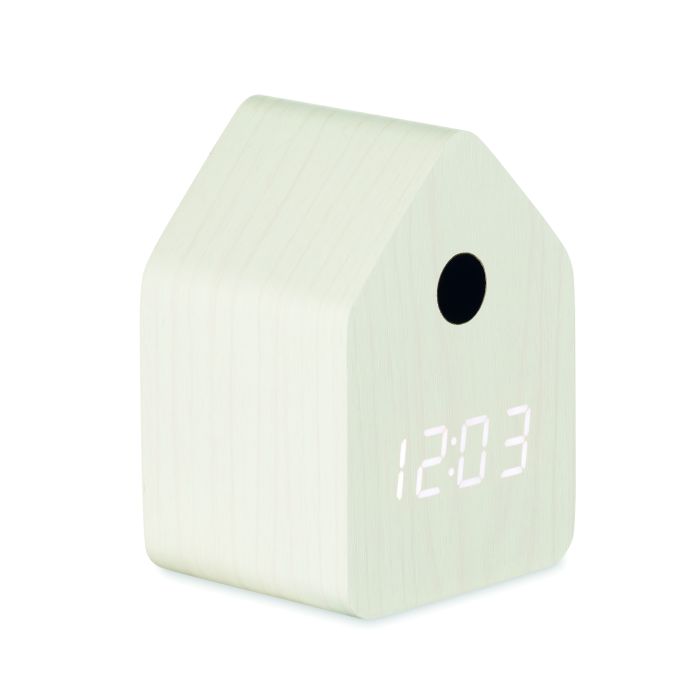 Ceas mic de birou din MDF, care include o alarmă încorporată cu voce de pasăre cuc și afișaj de temperatură. Afișaj LED alb. Sunetul se oprește automat între orele 22.00 și 06.00. Intervale de 5 minute pentru snooze