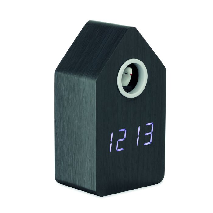 Ceas cu cuc din MDF care include o alarmă încorporată / afișaj de temperatură. Pasărea va ieși și are voce de pasăre cuc. Afișaj cu LED alb. Sunetul este redus automat la tăcere între orele 22.00 și 06.00. Interval de 5 minute pentru snooze.