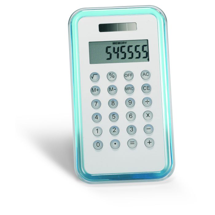 Calculator cu 8 cifre pe display, sursă de alimentare dublă şi apărătoare din aluminiu. 1 baterie tip celulă, inclusă.