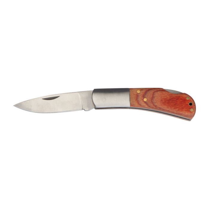 Briceag de înaltă calitate fabricat din oţel inoxidabil, cu blocare de siguranţă și mâner acoperit cu lemn.