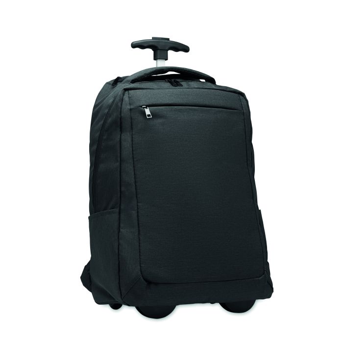 Rucsac laptop cu roți din poliester 600D RPET. Include un compartiment intern pentru laptop de 15 inch. Buzunar frontal cu fermoar. Două buzunare laterale glisante. Trei buzunare interioare glisante. Spate și curele de umăr căptușite. 2 roți și cadru cu tuburi duble.