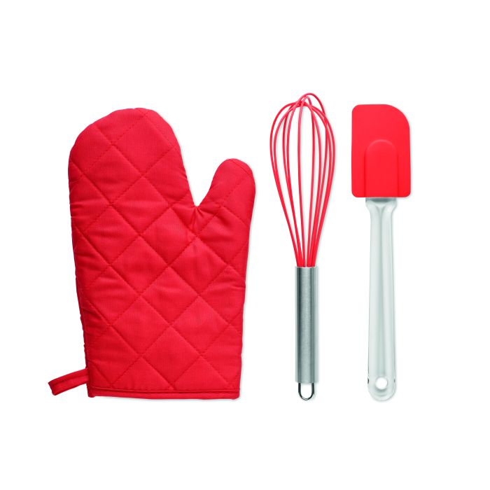 Set de accesorii pentru gătit. Include o mănușă de bucătărie pentru cuptor din amestec de fibre 95% poliester și 5% bumbac, un tel de bucătărie și o spatulă din silicon.