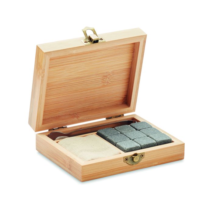 Set de 9 cuburi de gheață refolosibile din piatră și clește, în husă de bumbac și cutie de cadou din bambus. Bambusul este un produs natural, astfel pot apărea diferențe la personalizare.
