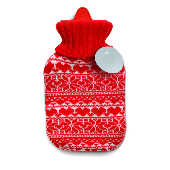 Hot water bottle with jersey in Nordic design. Used to provide warmth, typically whilst in bed, but also for the application of heat to a specific part of the body. 310 ml capacity.