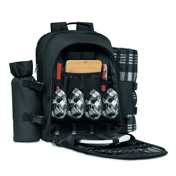 Picnic backpack in 300D RPET polyester for 4 people with cooling base compartment with high quality cutlery, 1 waiter style corkscrew, cutting board, bread knife and picnic blanket. Bag in Cationic dyed Polyester.