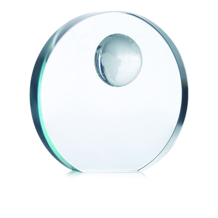 Elegant round trophy made in glass, featuring a relief half globe pattern on top. Presented in a classic gift box.