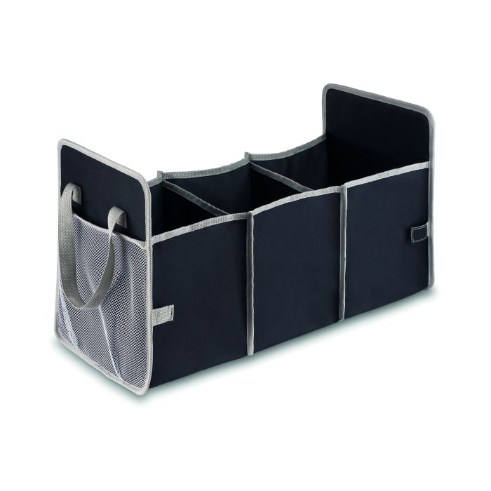 Foldable car organizer in 600D polyester with mesh pocket on side. When not in use, you can fold this up for compact storage. Also, this makes driving safer as it will prevent items from possibly rolling under the drivers feet.