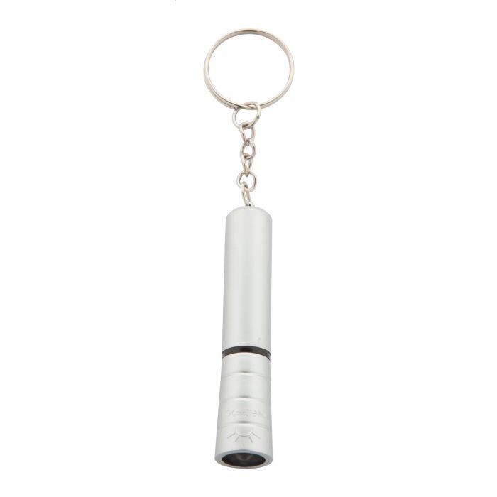 Plastic, mini flashlight with 1 LED, metallic finishing and metal keyring. With button cell battery.