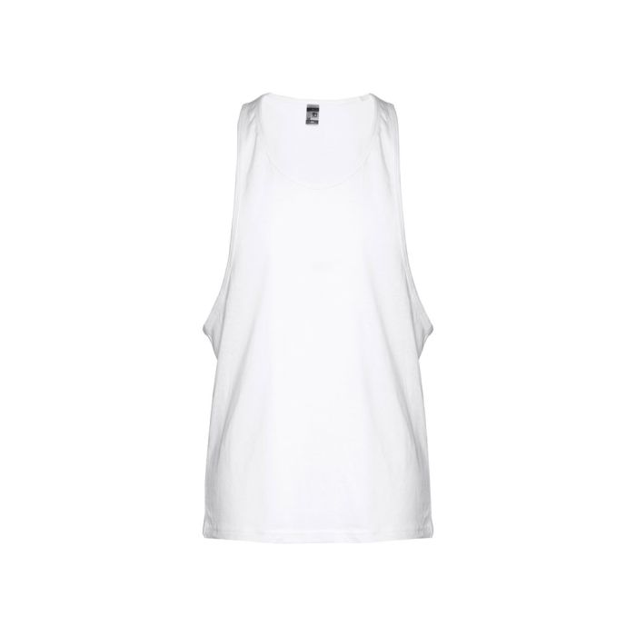 100% cotton men's sleeveless jersey (140 g/m²) with carded cotton yarn. Wide armholes and round collar, with bias tape on the armholes and neckline. Piece cut and sewn with double seam at the hemline. Sizes: XS, S, M, L, XL, XXL