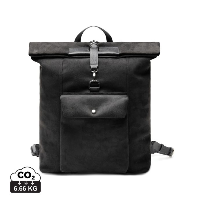 An elegant backpack suitable for any occasion. The backpack is made from recycled faux leather and PU details, adding style while you're on the go. A buckle and magnetic closure provide smooth and secure fastening. The exterior also features a practical outer pocket and a reinforced bottom. The wide opening allows easy access to your belongings, with an inner compartment for a laptop and a smaller zippered pocket for organised storage. Certified by RCS (Recycled Claim Standard), which ensures that the entire supply chain of recycled materials is certified. The total percentage of recycled material is based on the product’s total weight. This product contains 44% RCS-certified recycled polyester and 5% RCS-certified recycled PU.