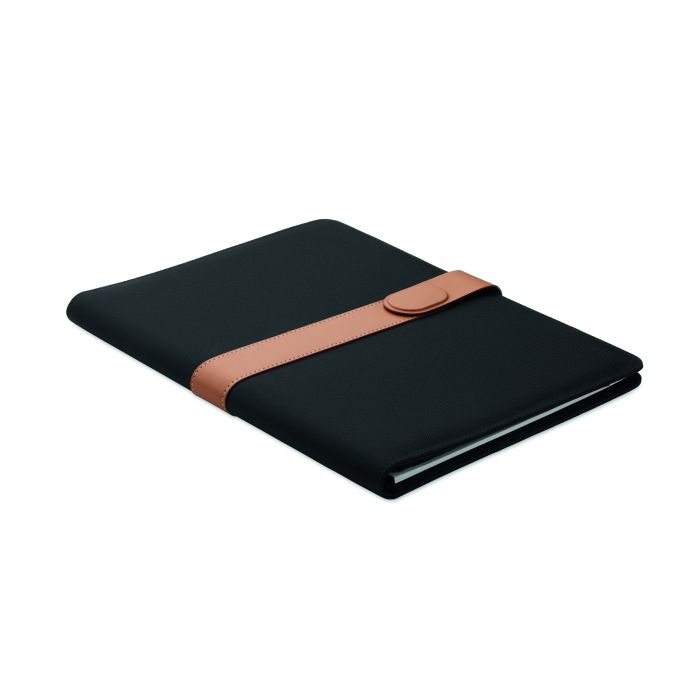Portofoliu A4 din RPET cu detalii din piele artificială. Blocul de notițe A4 reîncărcabil.30 de pagini liniate din hârtie reciclată. Suport pentru stilou. 4 suporturi pentru carduri, 3 buzunare mici și un compartiment mare. Închidere cu curea magnetică. FSC®-certified | FSC MIX , P8.6, FSC-C213206