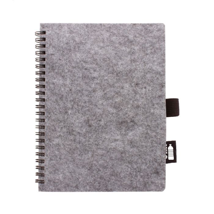 Caiet cu spirală, acoperit cu pâslă RPET, cu etichetă distinctă RPET și 80 de foi dictando din hârtie reciclată. Dimensiune A6.