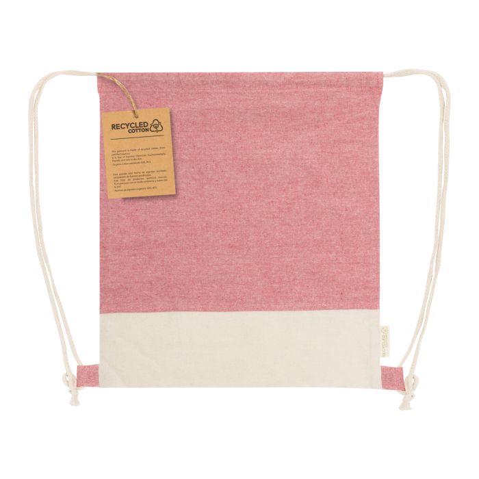 Rucsac bicolor, din bumbac reciclat, cu șnur, cu etichetă distinctivă din bumbac reciclat. 100% bumbac reciclat, 120 g/m².