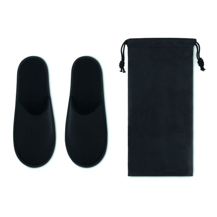 Pereche de papuci de hotel din poliester, prezentată într-o husă din material nețesut. Mărime EUR 43 - 44.