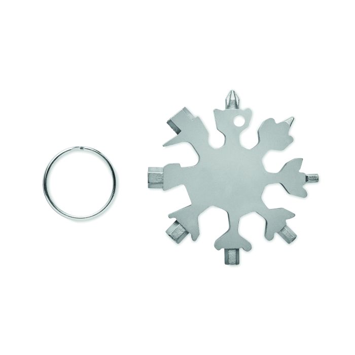 Unealtă multifuncțională 17 în 1 din oțel inoxidabil în formă de fulg de zăpadă. Inel metalic opțional inclus.