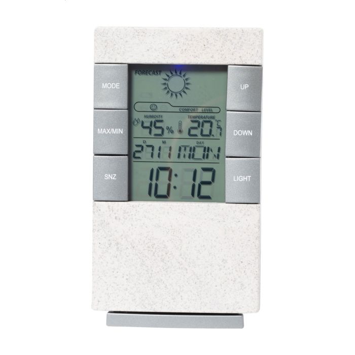 Ceas digital din plastic ecologic din paie de grâu și stație meteo cu termometru și afișaj de umiditate. Funcționează cu 2 baterii AAA, fără baterii.
