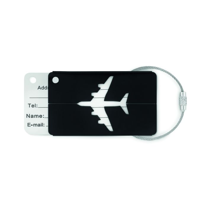 Etichetă de bagaje din aluminiu cu nume și adresă. Contine șnur și șurub.