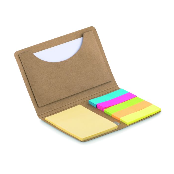 Suport de carduri din hârtie kraft. Bloc de notițe autocolante galbene de mărime medie din hârtie reciclată și 5 markere de carton de culori diferite. Închidere elastică.