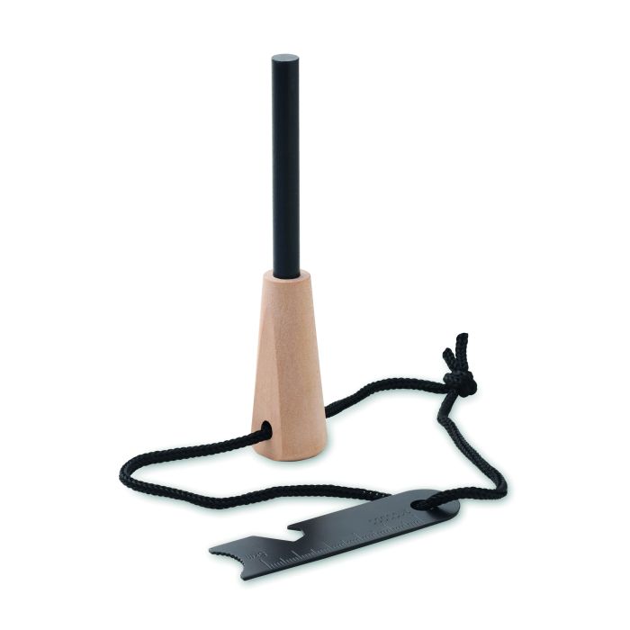 Unelte de aprindere a focului din lemn de pin și oțel inoxidabil, inclusiv un băț de aprindere, un răzuitor multifuncțional pentru utilizarea cu dispozitivul de aprindere a focului, un desfăcător de sticle, o riglă de precizie și o cheie hexagonală.
