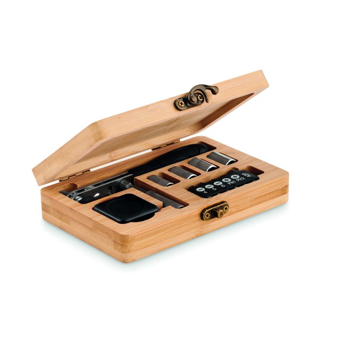 Set unelte din 13 piese prezentat într-o caseta din bambus cu 6 fante în suport: 3 dimensiuni capete surubelnita (4, 5, 6mm), 2 dimensiuni Philips (PH1, PH2) și 1 adaptor, 4 prize (7mm, 8mm, 9mm, 10mm), 1 mâner, 1 conector și 1 ruleta. Bambusul este un produs natural, în consecință pot apărea diferențe de culoare, dimensiune sau desen. FSC®-certified | FSC 100%, N5.7, FSC-C213206