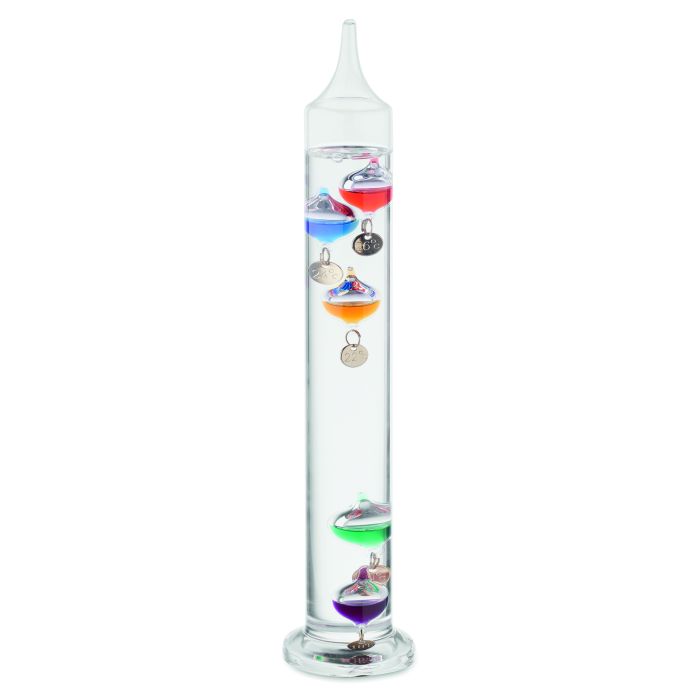 Termometru Galileo din sticlă cu cinci globuri plutitoare colorate și bază lemn. Fiecare glob indică temperatura de la 18°c la 26°: Roșu 26°, albastru regal 24°, portocaliu 22°, verde 20° și violet 18°. Cel mai mic glob din grupul de sus indică temperatura ambientală.