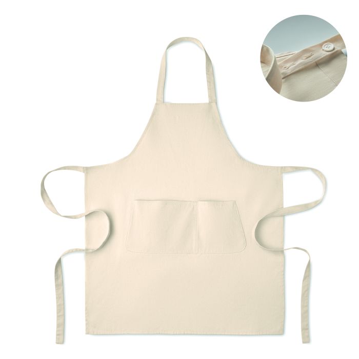 Șorț cu bretele reglabil cu 1 buzunar frontal mare cu 2 compartimente din bumbac organic 240 gr/m². Cu buton reglabil pe cureaua de la gât. Acest produs este certificat OEKO-TEX® STANDARD 100.