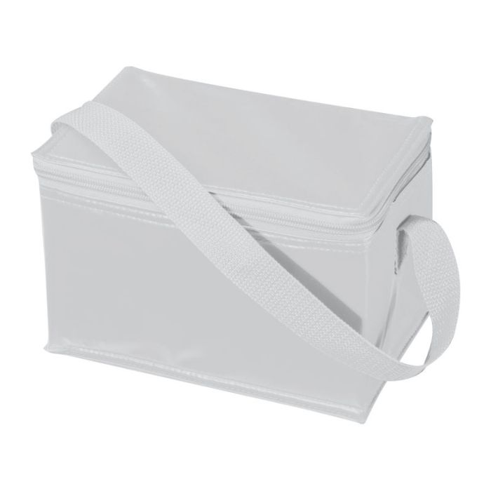Geantă frigorifică simplă din poliester, potrivită pentru 6 cutii de 0,33 litri, cu bretea de transport.