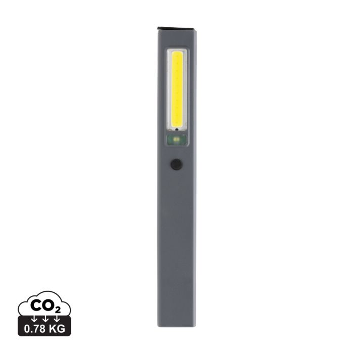 Pocket size inspection light made with RCS certified recycled ABS plastic. Total recycled content: 33% based total item weight. RCS certification ensures a completely certified supply chain of the recycled materials. The work light uses a re-chargeable A-grade 520 mah lithium battery so no need to replace the batteries. Simply re-charge via your USB socket. The work light comes with 220 lumen COB light and 80 lumen LED light. With 3 modes: LED, COB and COB red. With clip to attach to belt or pocket and magnet. With type C port for re-charging. Operating time on one charge: 3 hours.