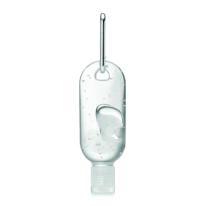 Gel de curățat mâini în flacon PET reîncărcabil, cu capac flip și carabină. Capacitate de 30 ml.