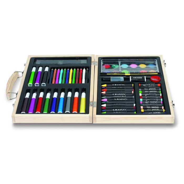 Set de desen 66 obiecte (creioane de ceară, acuarele în ulei, markere, creioane colorate, acuarele în apă, ascuţitoare, lipici, radieră, pensulă, riglă, și creion.)