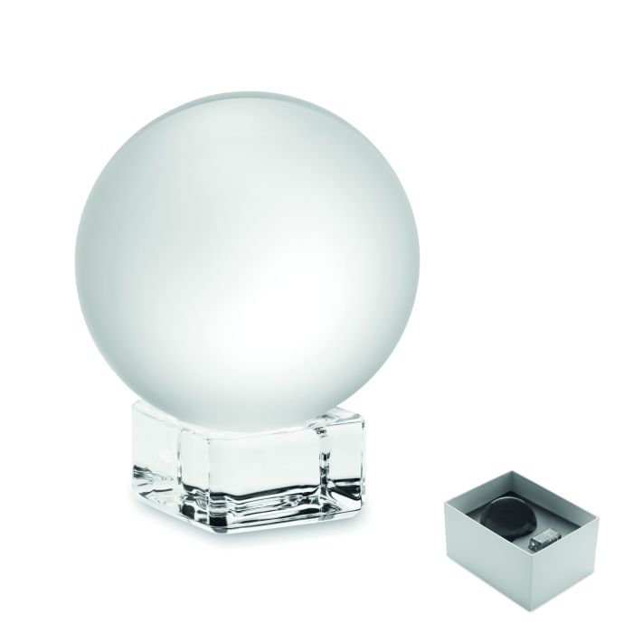 Premiu sau trofeu rotund din sticlă cu bază. Prezentat într-o cutie cadou.
