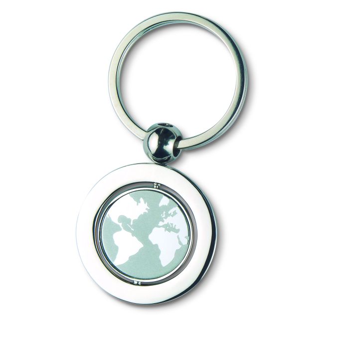 Breloc din aliaj de zinc cu decorațiune glob în cutie din carton.