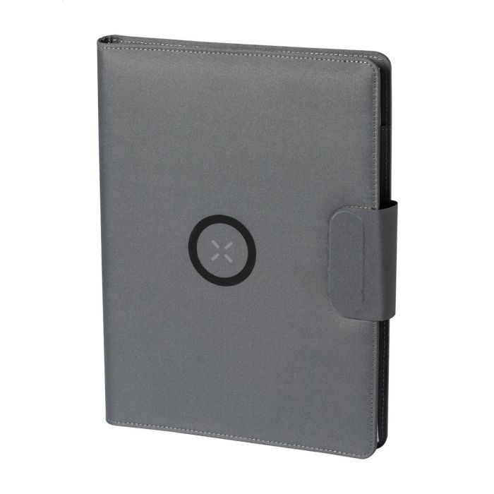 Mapă pentru documente, din poliester 300D RPET, dimensiune A4, cu încărcător rapid magnetic fără fir (10W), power bank de 5000 mAh cu port de încărcare USB, suport mobil pliabil și carnet cu 20 de foi dictando. Include inel metalic autoadeziv pentru a utiliza funcția magnetică pe orice dispozitiv încărcat fără fir. Inclusiv cablu de încărcare USB.