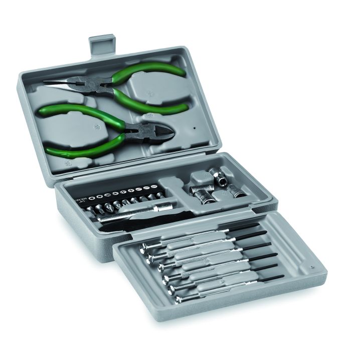 Set pliabil cu 25 de scule în cutie de plastic. Conține pensete, set cu 6 șurubelnițe, mâner prelungitor, set cu 4 mufe, clește de tăiat și patent și set cu 10 capete interschimbabile pentru șurubelniță.