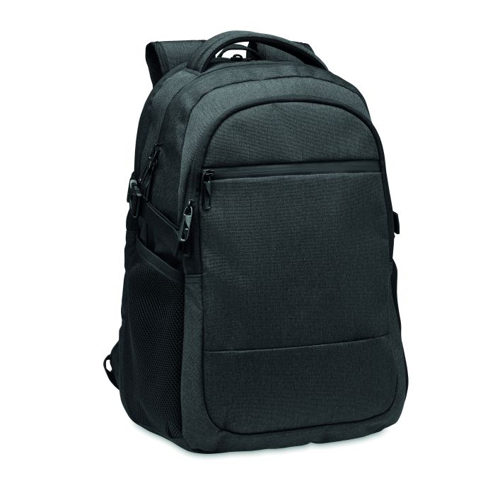 Rucsac pentru laptop de 15 inch din poliester 600D RPET. 3 compartimente exterioare mari cu fermoar, complet căptușite, cu mai multe buzunare interioare. Are două buzunare laterale cu plasă. Curele de umăr reglabile. Partea din spate căptușită cu plasă de aerisire. Suport pentru troler pe partea din spate.