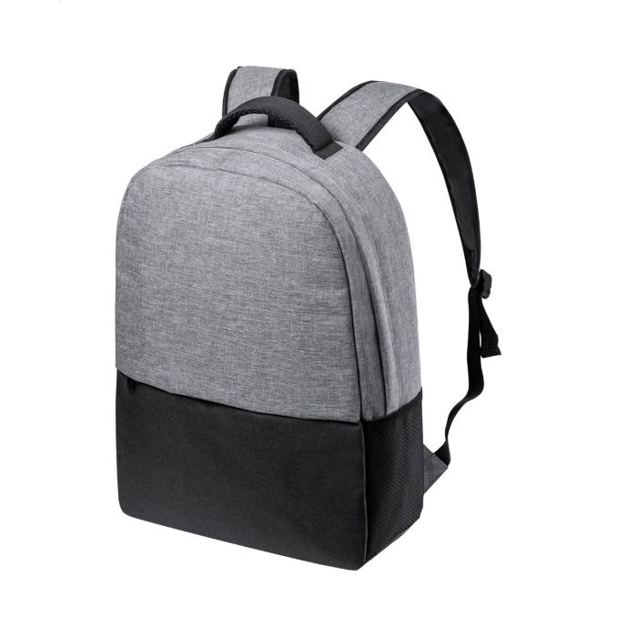 Rucsac in două culori, tip RPET, cu compartiment principal cu fermoar, compartiment căptușit pentru laptop (15") și tabletă (10"), buzunare laterale, spate căptușit și curele de umăr. Poliester reciclat 600D.