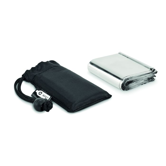 Pătură de urgență din poliester RPET ambalata in pouch cu snur de tragere. Dimensiune pătură: 130 x 210 cm.