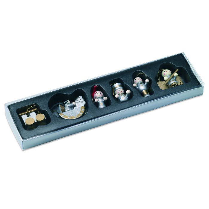 Set cu 6 decoraţiuni din lemn pentru bradul de Crăciun. Ambalate în cutie de carton cu capac transparent.