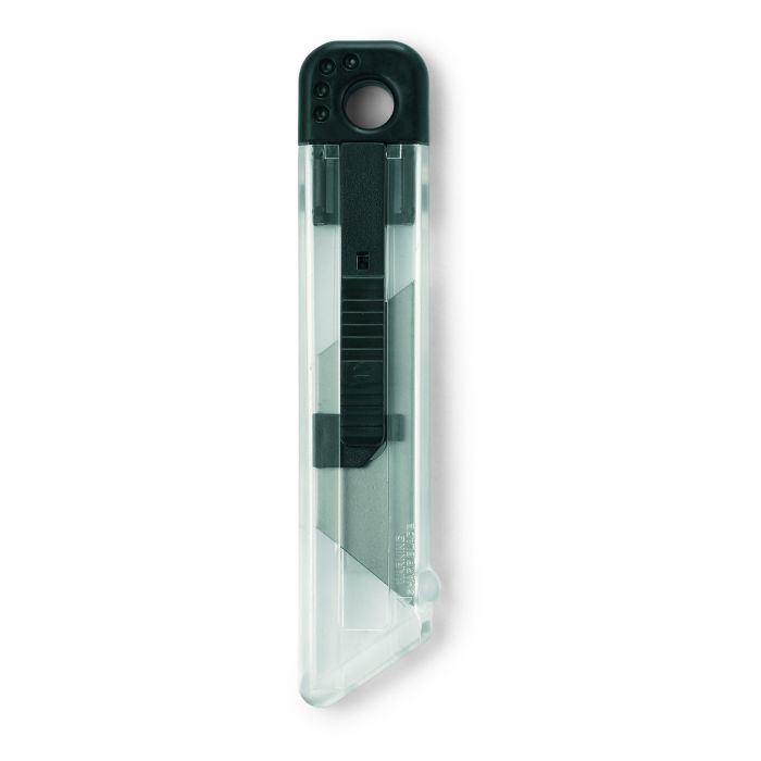 Cuțit retractabil cu carcasă transparentă colorată din plastic.