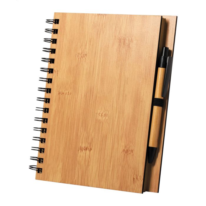 Carnețel spiralat B7 cu copertă din bambus. Pix din bambus cu mină neagră. 80 file dictando.