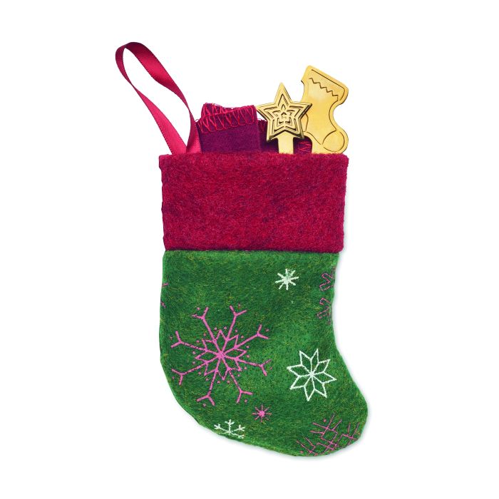 Set de tacâmuri pentru desert de Crăciun, inclusiv lingură și furculiță din oțel inoxidabil, cu un șervețel din bumbac de 150 gr/m². Ambalat în formă de ciorap de Crăciun.