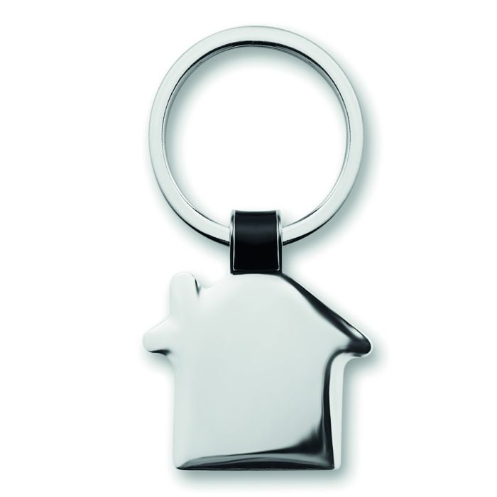 Breloc metalic cu finisare nichelată, în formă de casă.