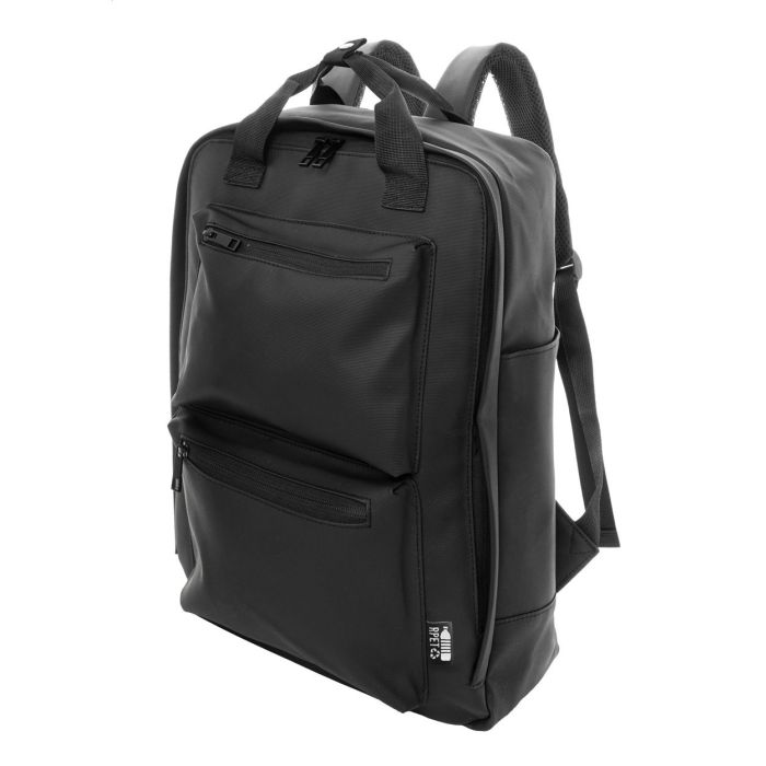 Rucsac din piele PU moale reciclată, impermeabil, cu compartiment principal cu fermoar, 2 buzunare frontale cu fermoar, buzunare laterale și compartiment căptușit pentru laptop (15") și tabletă (10"). Cu spate căptușit și bretele de umăr. Cu etichetă distinctivă din PU reciclată.