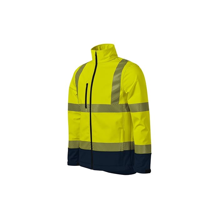îmbrăcăminte de vizibilitate ridicată în două culori, softshell cu membrană în trei straturi, material impermeabil, imperrespirabil în culoare fluorescentă, benzi reflectorizante cu structură segmentată, partea din spate este prevăzută cu platcă simplă, fermoar spiralat în sens invers pe toată lungimea cu protecție pentru bărbie, tivurile mânecilor sunt ajustabile prin sistemul velcro, buzunare cu bordură și fermoar spiralat în sens invers, buzunar aplicat la nivelul pieptului , buzunar cu fermoar aplicat pe interior la nivelul pieptului în vederea personalizării, partea din spate este curbată și puțin alungită, tivul inferior este prevăzut cu șnur elastic, agățătoare, fleece interior cu finisaj antiscămoșare, model conform cu standardele EN ISO 20471/A1 (clasa 2 - M, L; clasa 3 - XL - 4XL) și EN ISO 13 688