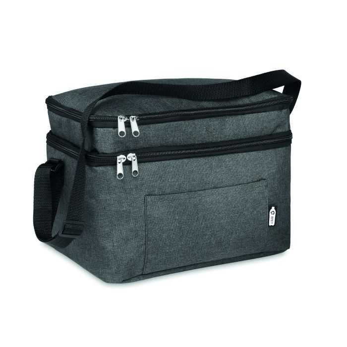 Geantă răcire, în 2 culori 600D RPET cu 2 compartimente. Curea de umăr reglabilă și buzunar frontal. Material de izolare: 0,15 mm PEVA + 3 mm spumă.