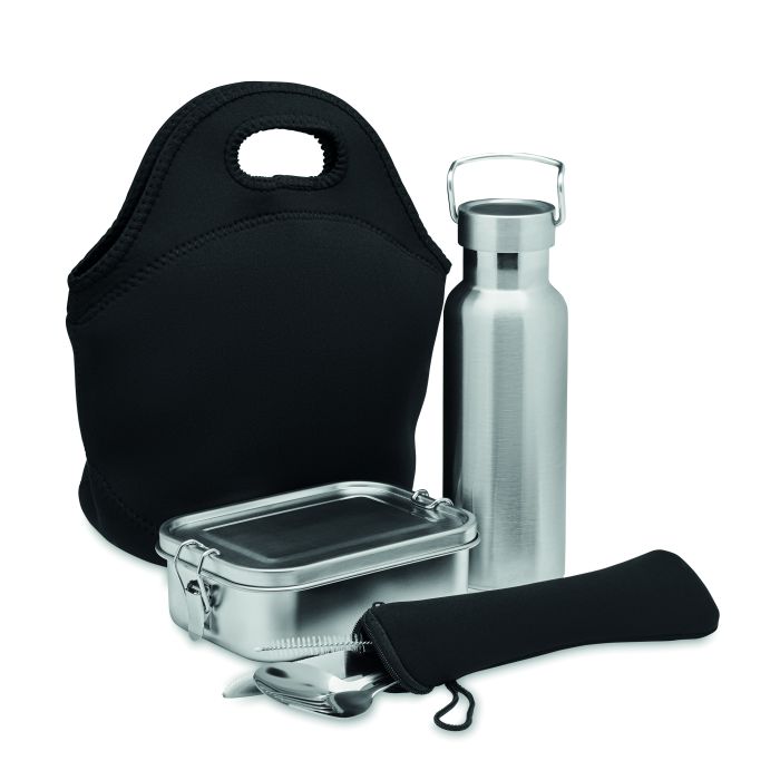 Set de prânz prezentat în geantă din neopren. Include termos din oțel inoxidabil cu perete dublu (500 ml) , caserola (600 ml) și tacâmuri ambalate în pouch de neopren cu fermoar.