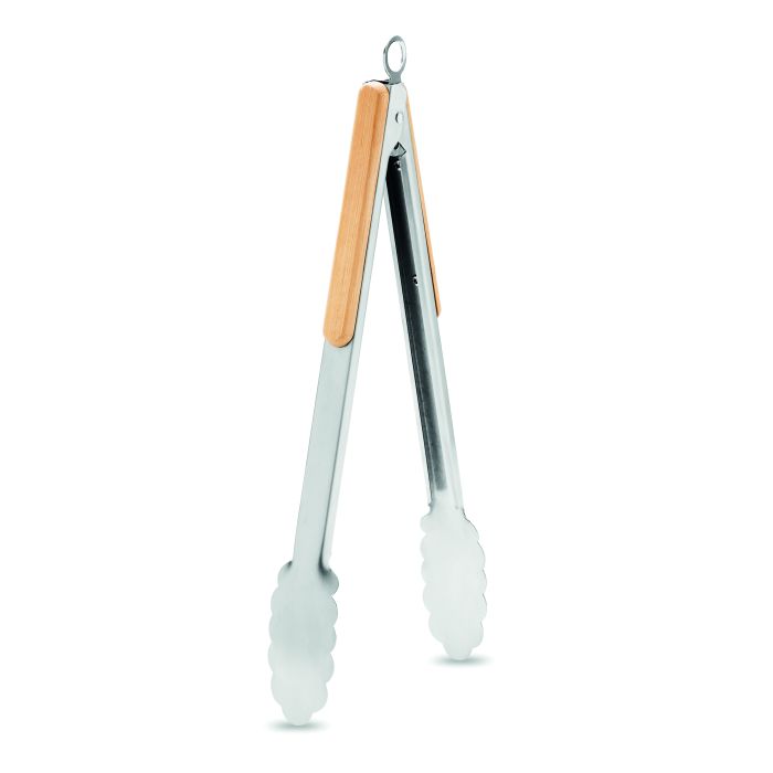Clește pentru grătar din oțel inoxidabil cu mânere din bambus. Mecanism de blocare. Bambusul este un produs natural, în consecință pot apărea diferențe de culoare, dimensiune sau desen.